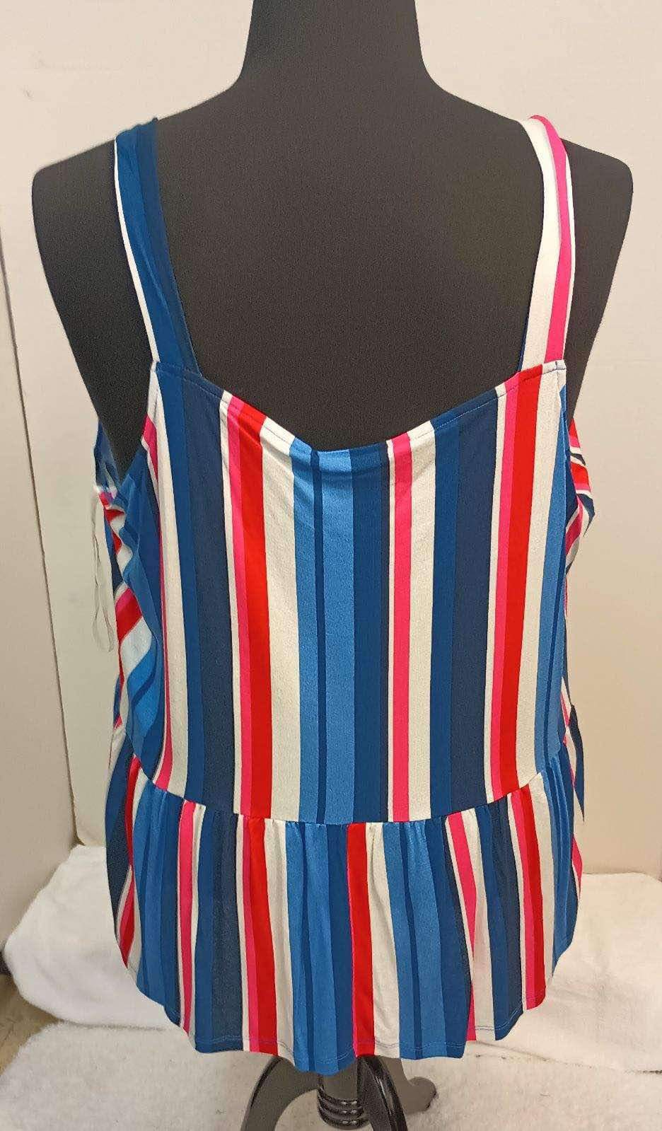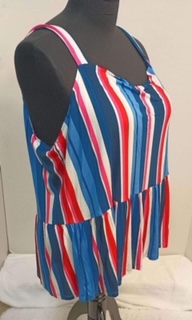 Lane Bryant swing collection tank top. Horizontal stripes to flatter your figure. The stripe colors are navy, medium blue, vivid pink, red and a soft white. Pull out one of the many colors in this top and find a bottom in that shade to pair with it. So many choices for you when you choose this lovely top.