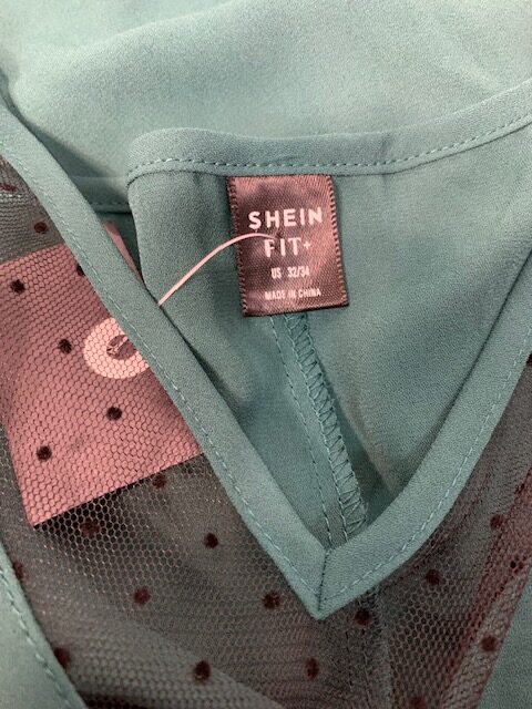 Shein Fit + sleeveless top in a pine green with polka dot black mesh accents.