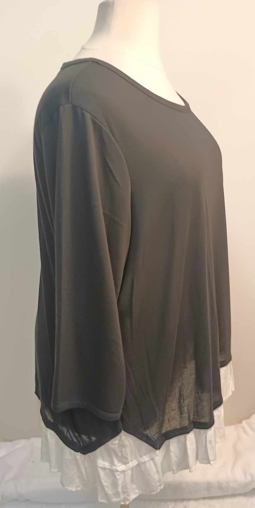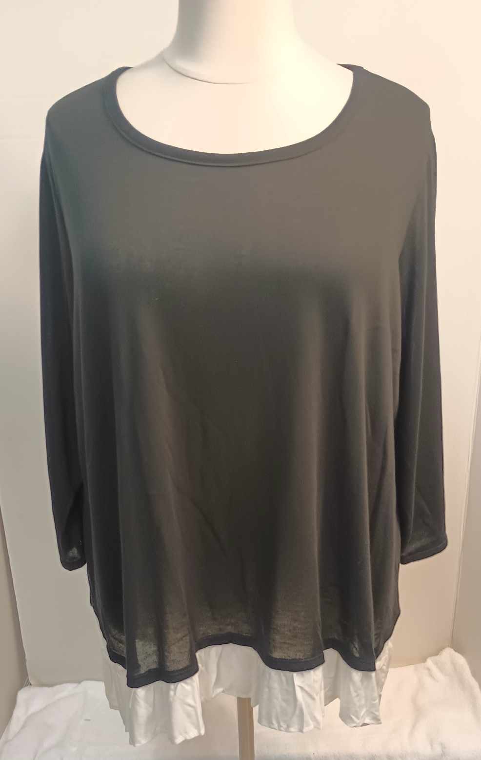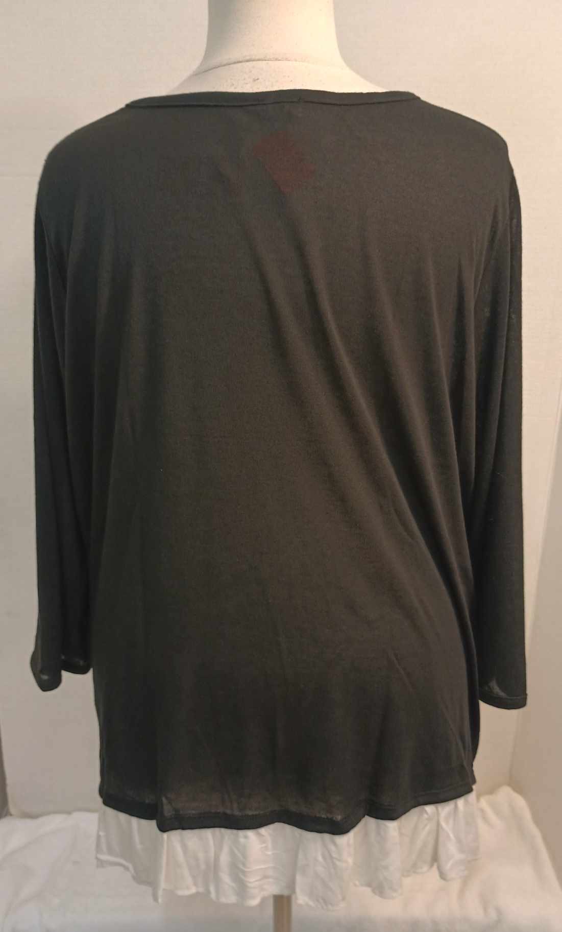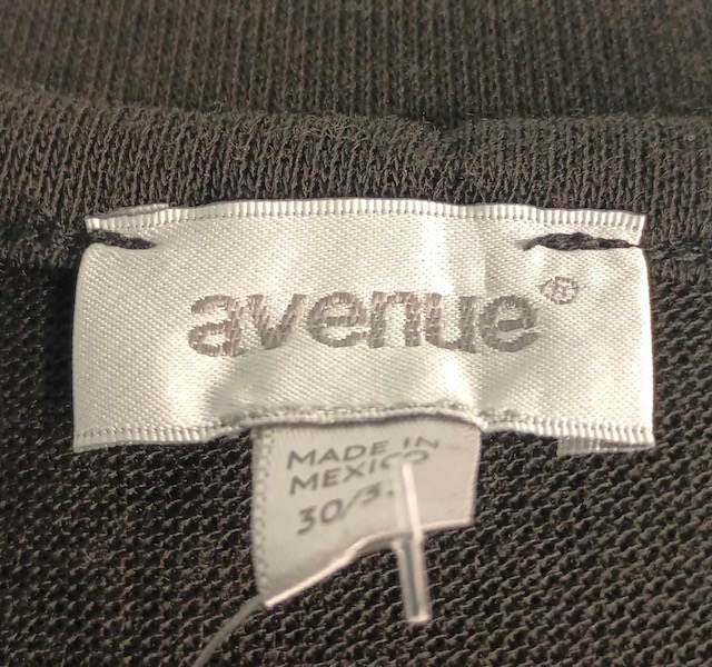 This is an awesome, lightweight and thin sweater top from Avenue. Has 3/4 sleeves. Soft Black fabric, made of 87% polyester, 10% rayon, 3% spandex. VERY stretchy. The white fabric at the bottom edge, to create the look of an under shirt is made of 100% rayon.