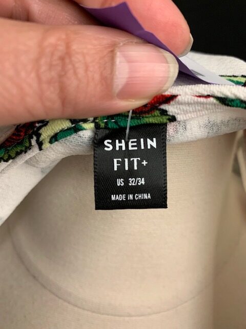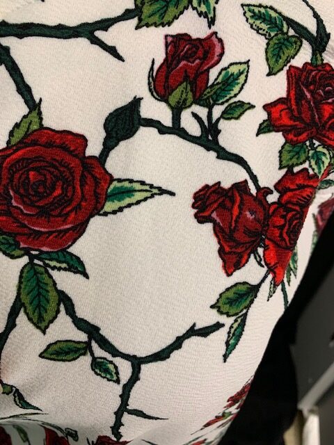 This top from Shein is a white background with beautiful shades of red roses, green leaves and black stems. Would pair perfectly with black or “army” green bottoms.