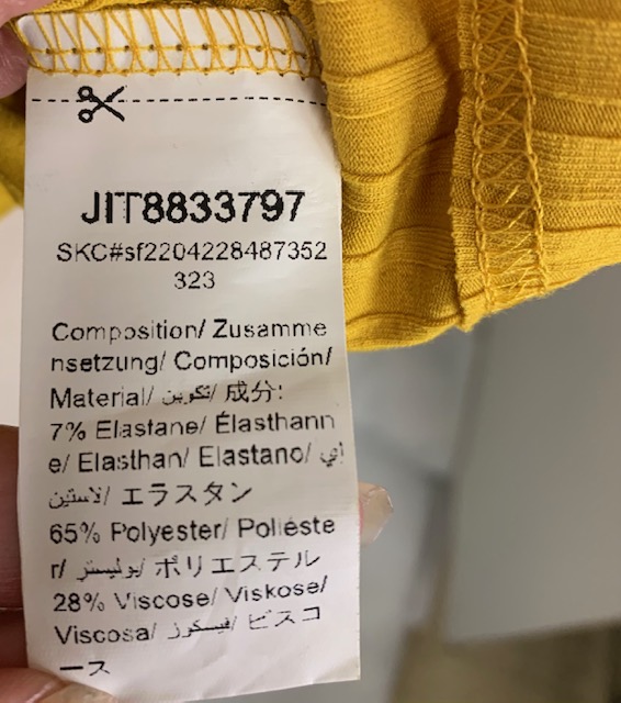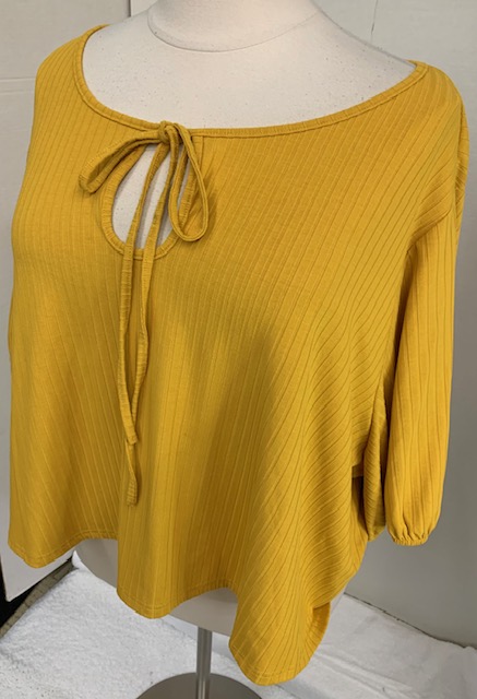This new condition top from Shein is considered golden or mustard and ribbed. In a 65% polyester, 28% viscose and 7% elastane fabric, it has lots of stretch. Made more in the “crop top” style, this top will lay perfectly on those who are “short waisted” as it has a 28″ length.