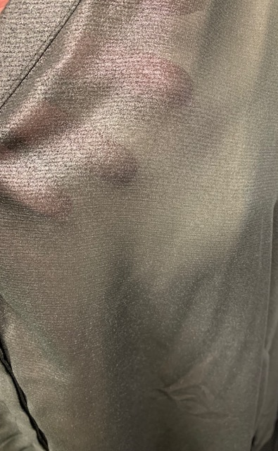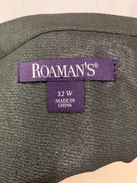 This brand new shirt from Roaman’s is made of 100% polyester with a sheer shimmery silvery metallic look to it.
