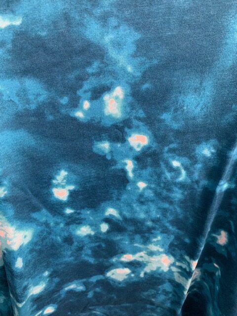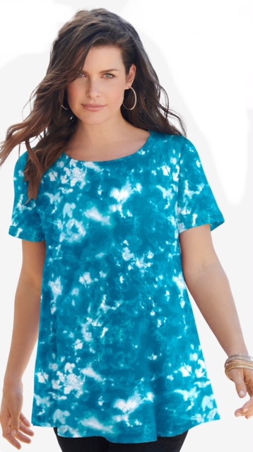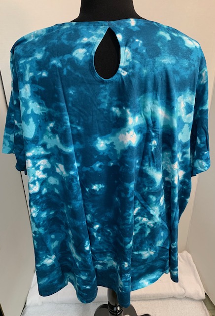 This AWESOME top is a teal acid tie die print, Fabric is made of 100% cotton and has good stretch! A pretty keyhole at the back of the neck dresses up the back of this shirt. Swing silhouette. Straight hem. This top wears and washes beautifully. To preserve it longer, do NOT dryer! Very flowy and not clingy!
