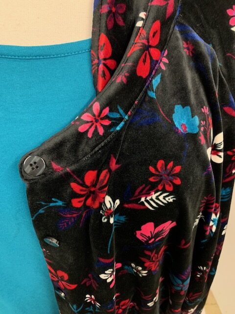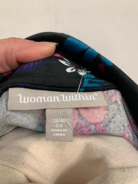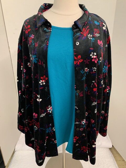 NEW. This tunic length shirt/jacket is a button down that could be worn open as a jacket or button it up as a shirt. Black background with a colorful floral print. Matching shirt is sold separately, if still available, its a size 3X (30/32).