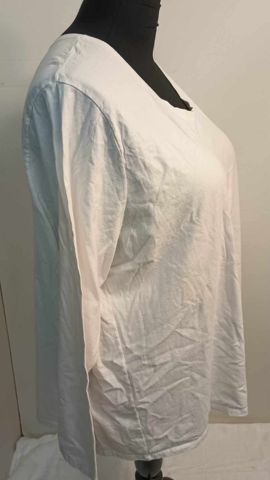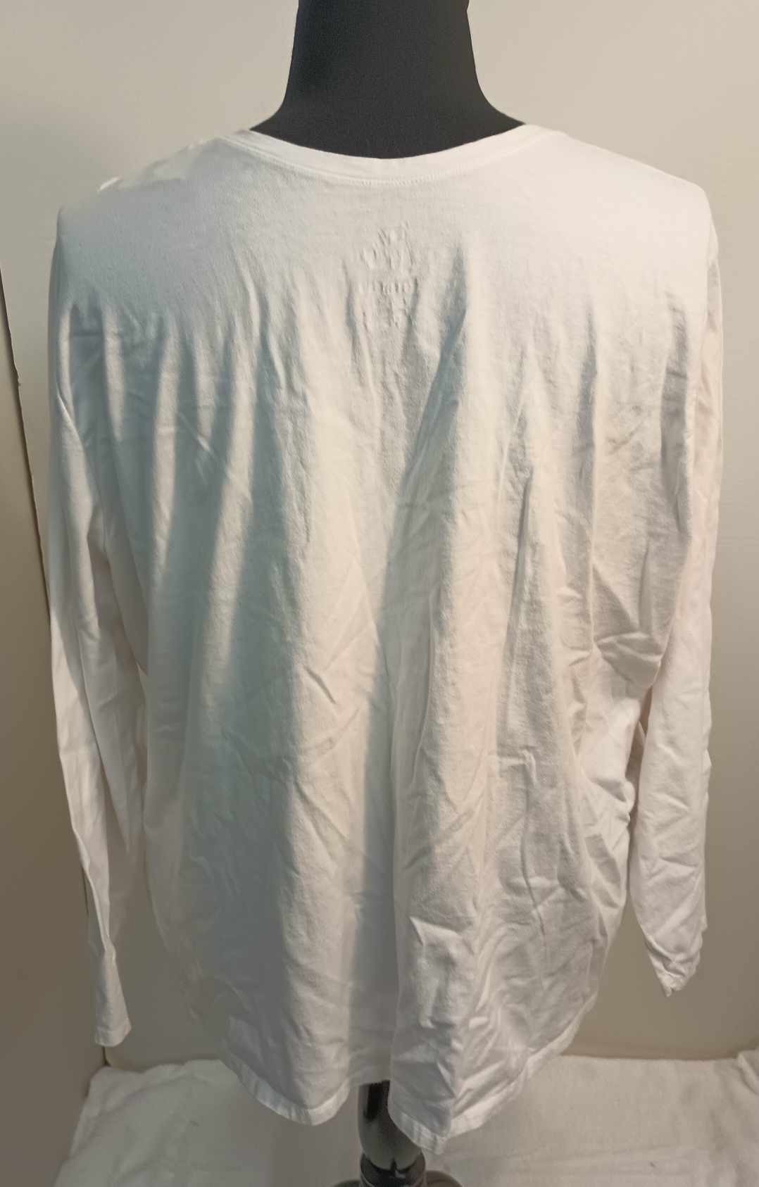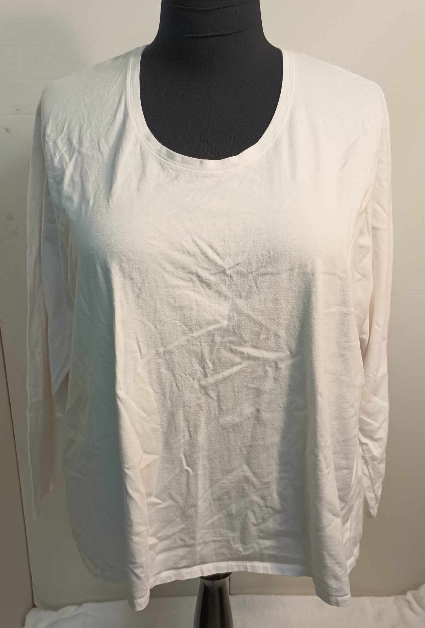 This top is white, long sleeve, and made of a stretchy knit material. It is all one solid color. It is about 29.5″ in length. Fabric is made of 100% Cotton. For a looser fit, we recommend sizing down and being more of a 4X.