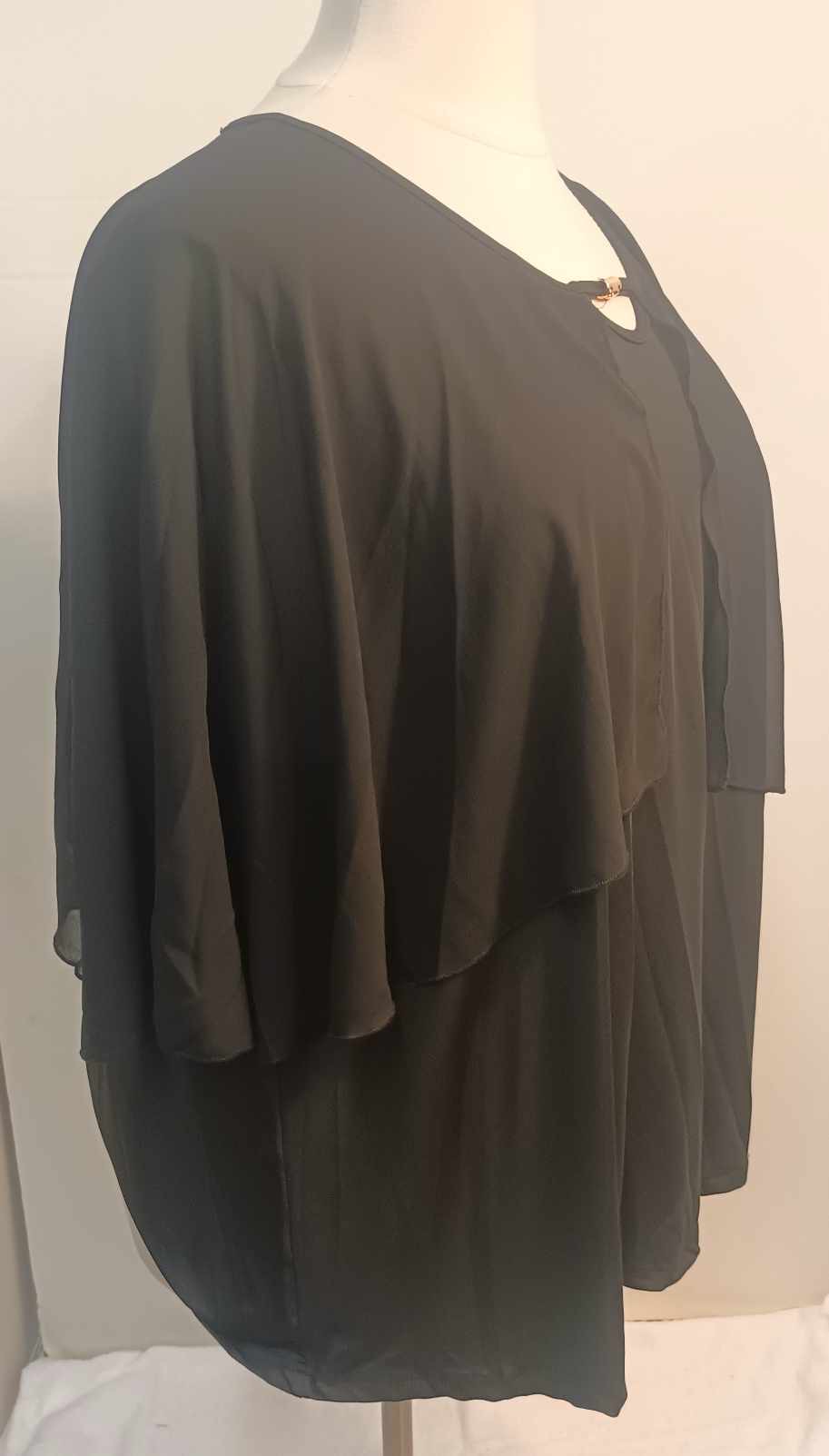 This gorgeous black top does not have a name brand on the tag, however it has a nice sheer flow material to cover your arms and a small gold piece decorated on the neckline. It has nice stretch!