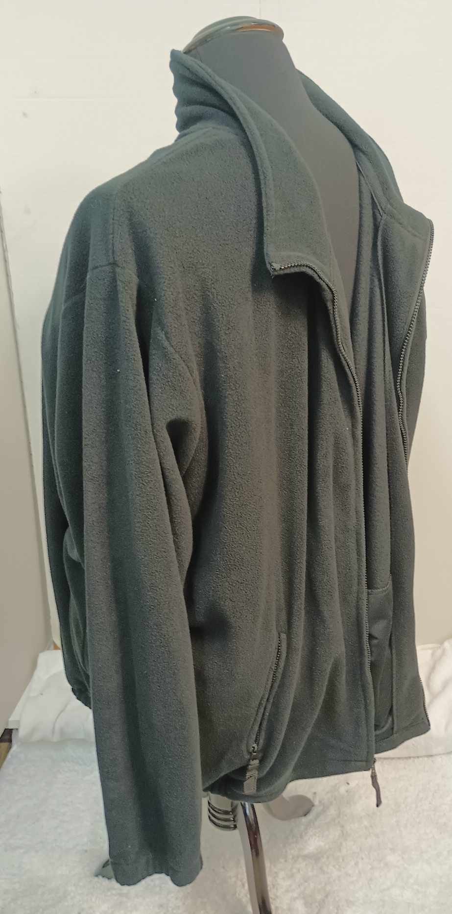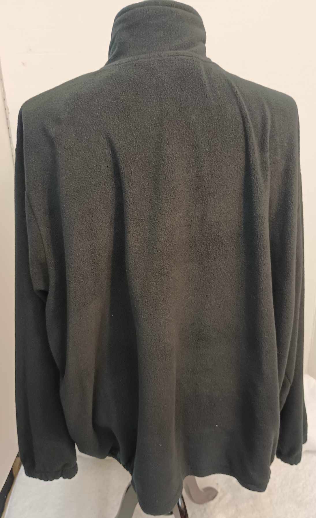 This gently used King Size jacket is a black jacket made of 100% polyester. It has a little stretch and is a 6x it fits like a 5x on our 24/26w mannequin. It is 36 inches from shoulder to waist and it has two closeable pockets and no hood.