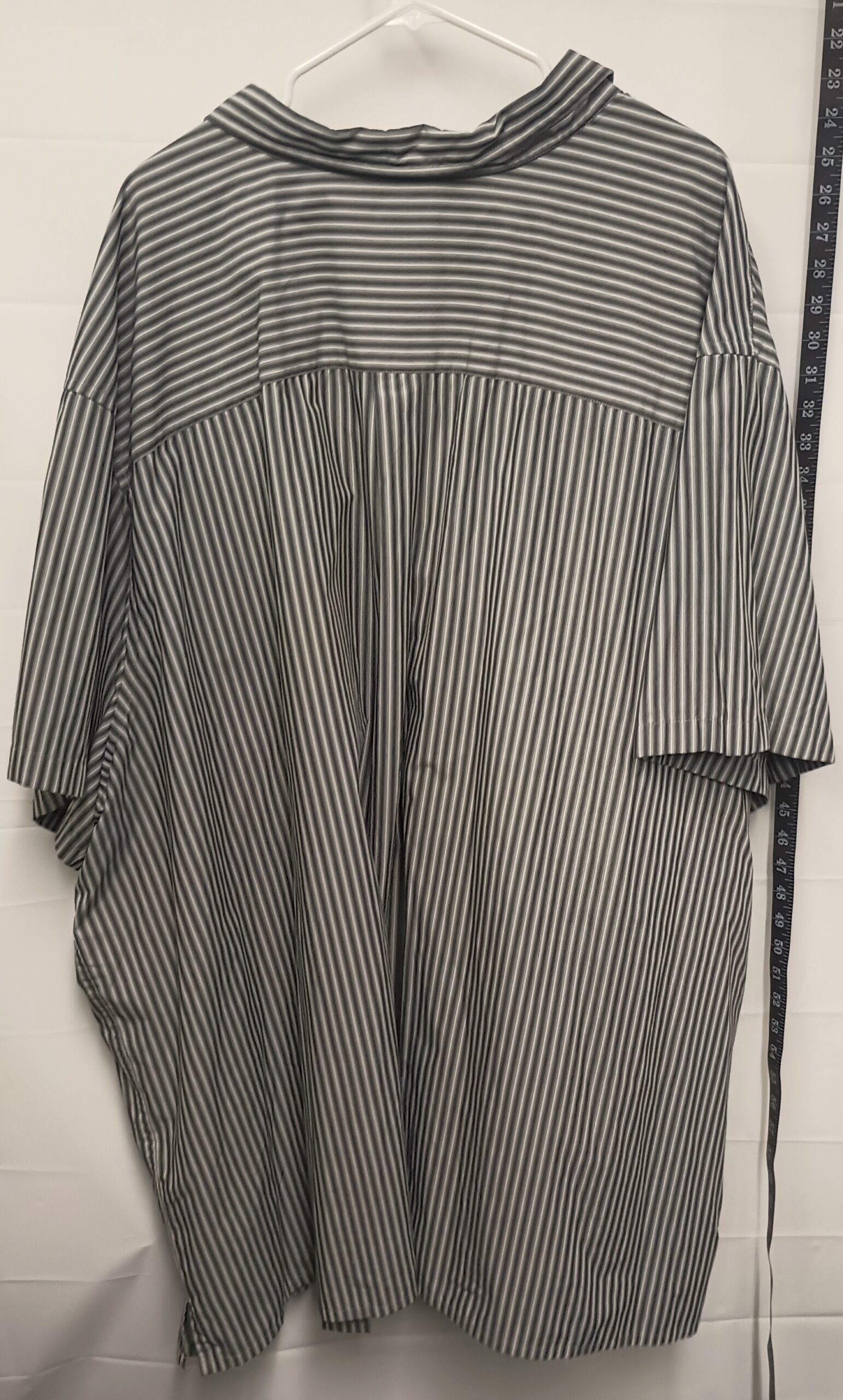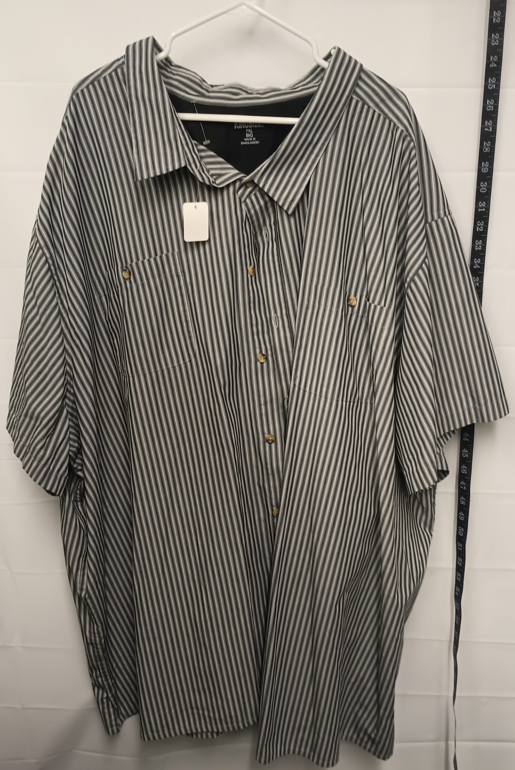 This new condition king size button-up t-shirt. Has black, light grey, and white colors in a stripe pattern. The fabric is made of a blend of 55% cotton and 45% polyester and is a 7x. It has no stretch and it is 38 inches from shoulder to waist and it has two pockets on the chest.