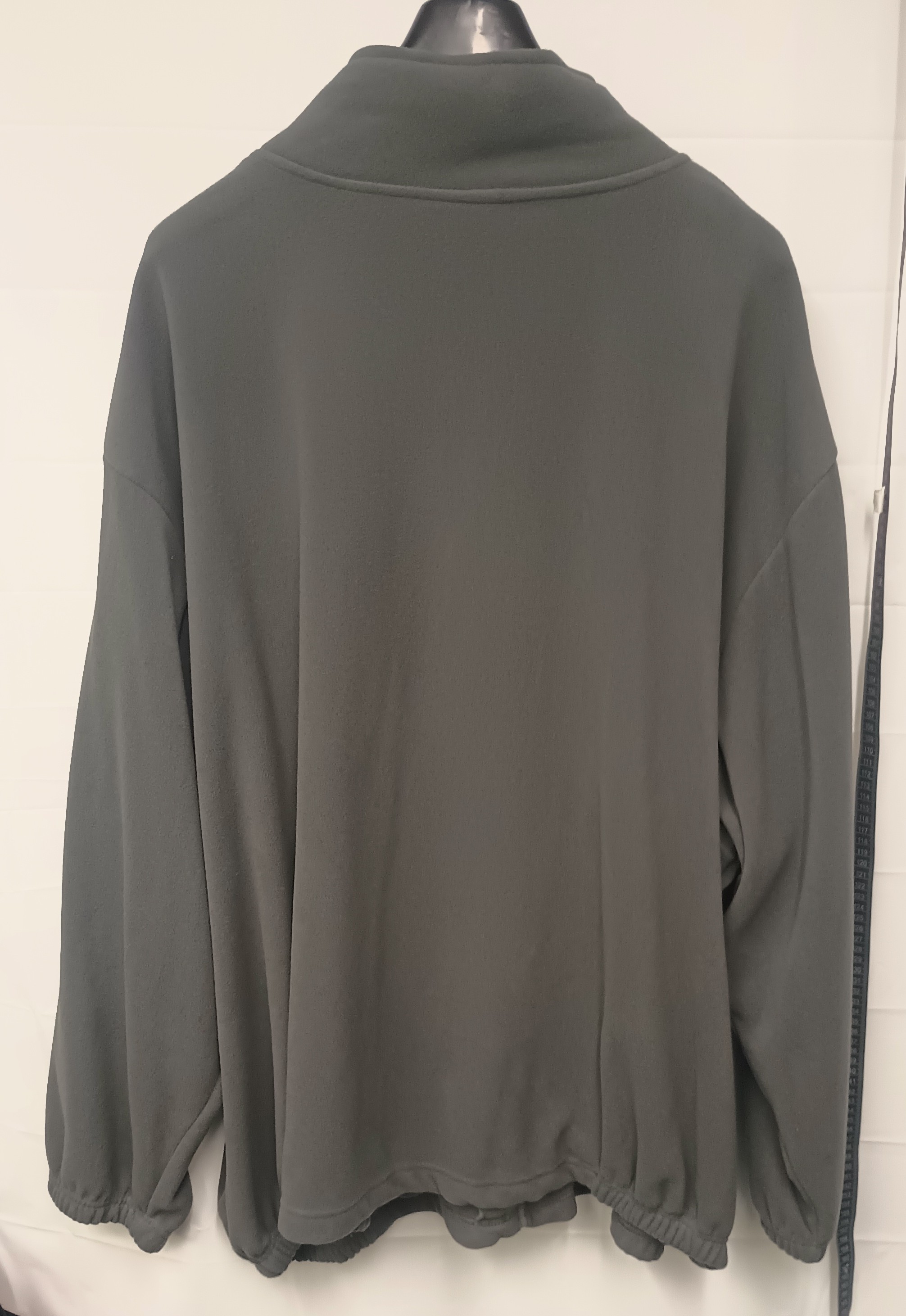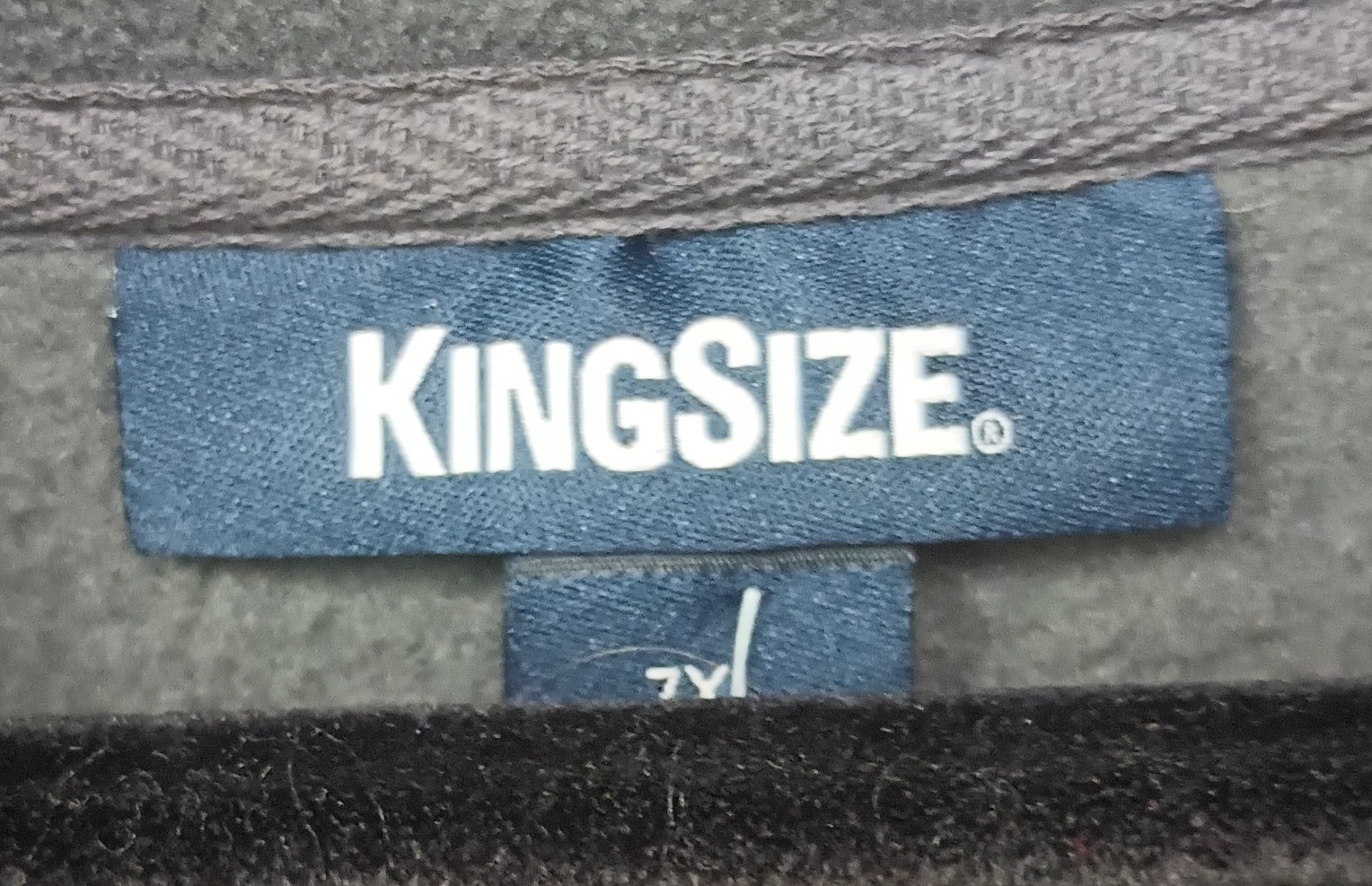 This gently used King Size jacket. Is gray and made of 100% polyester. It has no stretch and it is a 7x. It is 35 inches from shoulder to waist and it has two closeable pockets and no hood.