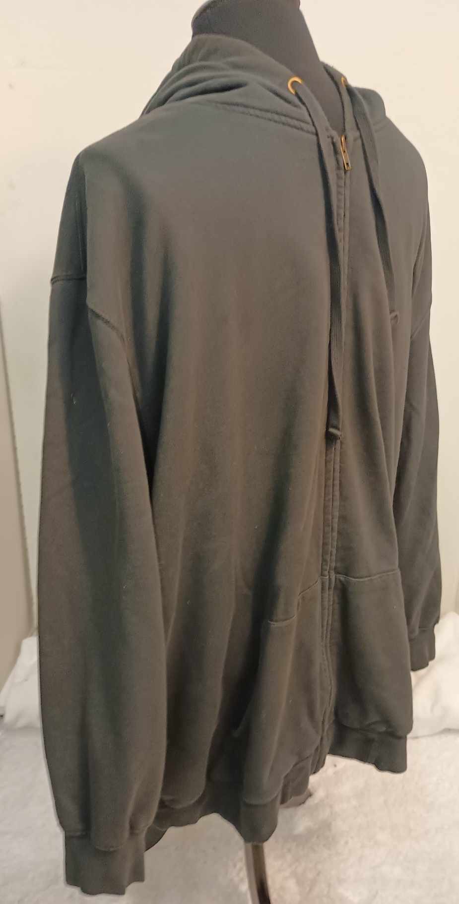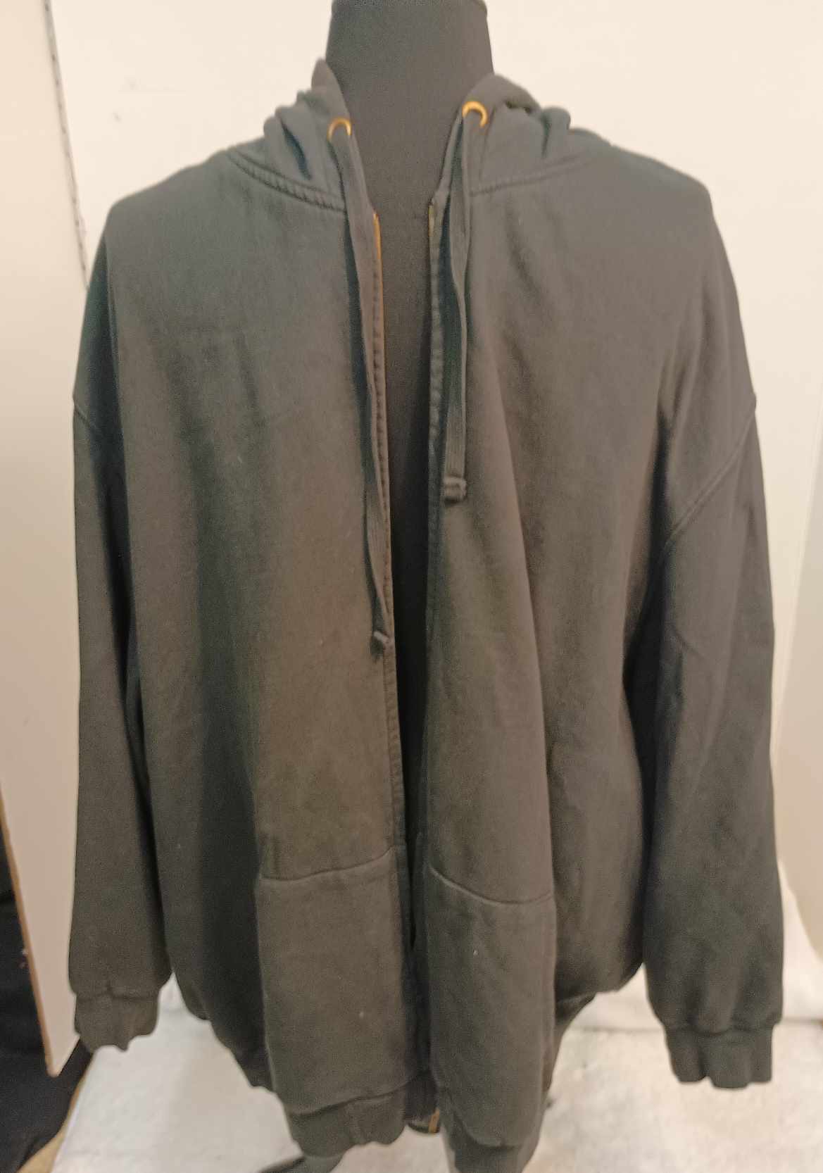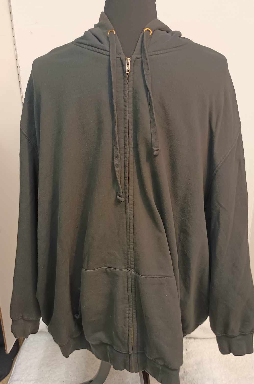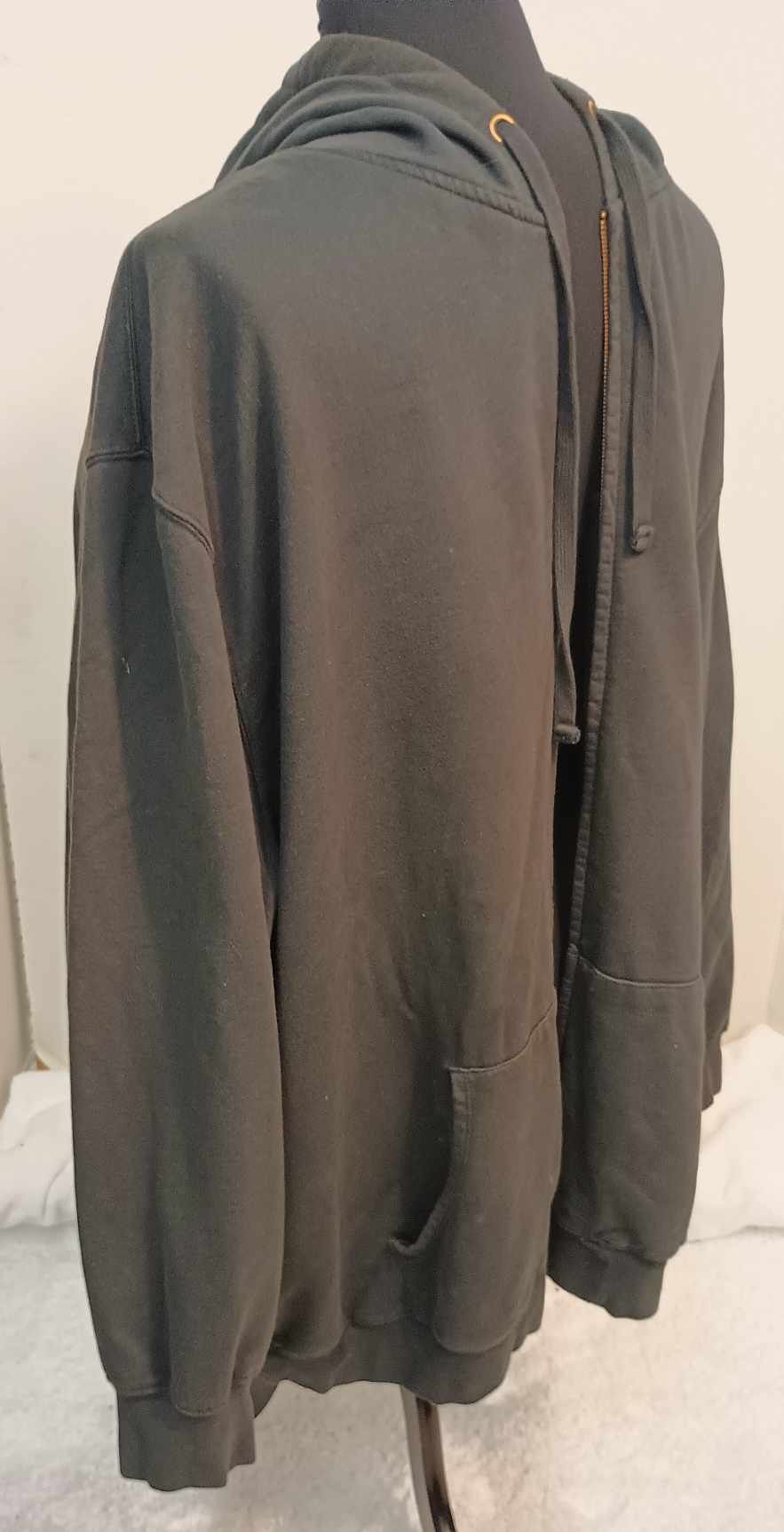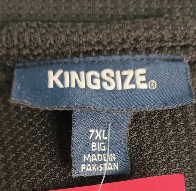 Gently used King Size jacket. It’s a black jacket made of a blend of 80% cotton and 20% polyester. It has a little stretch and is a 7x and fits like a 5x on our 24/26w mannequin. It is 36 inches from shoulder to waist and has two pockets.
