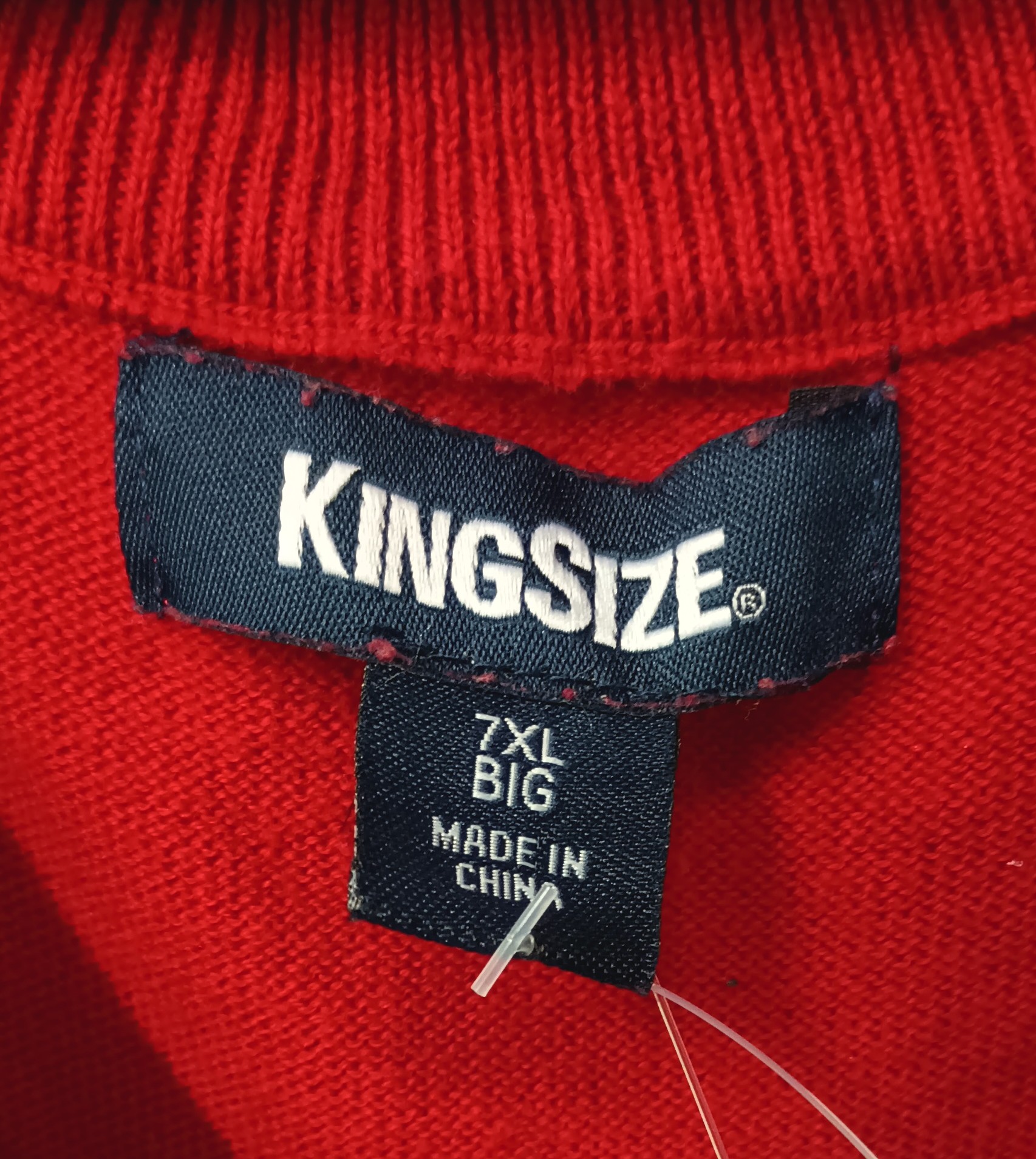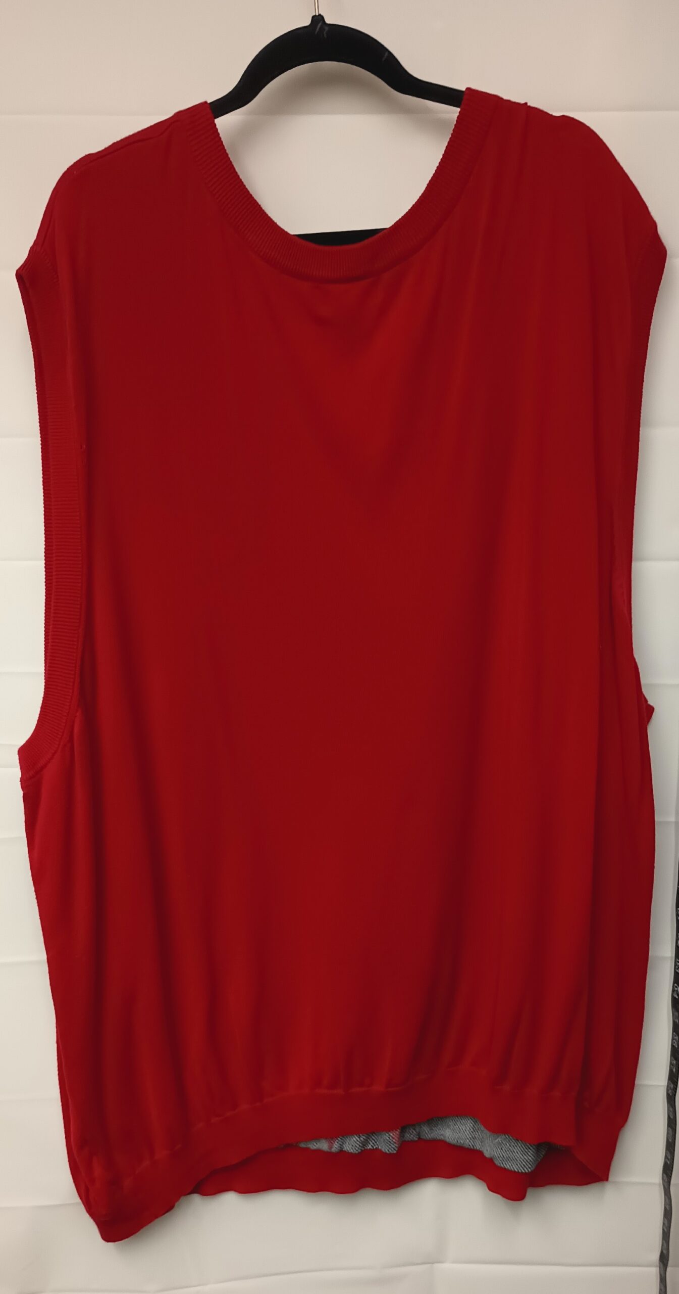This new condition kingsize sweater vest. Is red with gray, navy blue, and white pattern colors and is made of 100% cotton. It has no stretch and is a 7x and it is 38 inches from shoulder to waist.