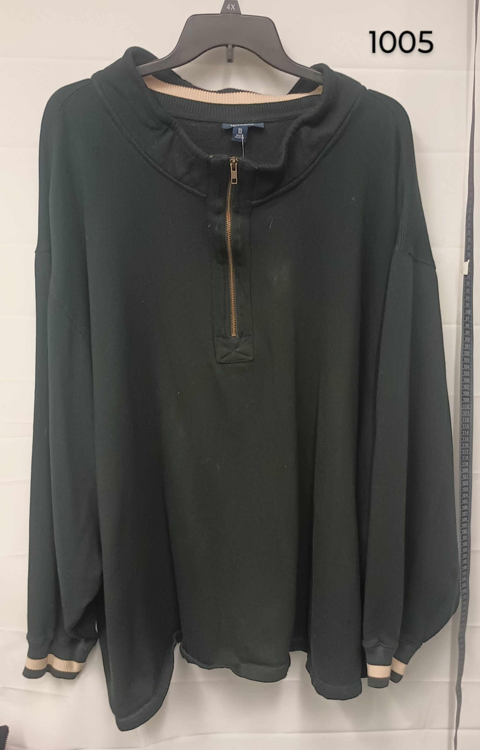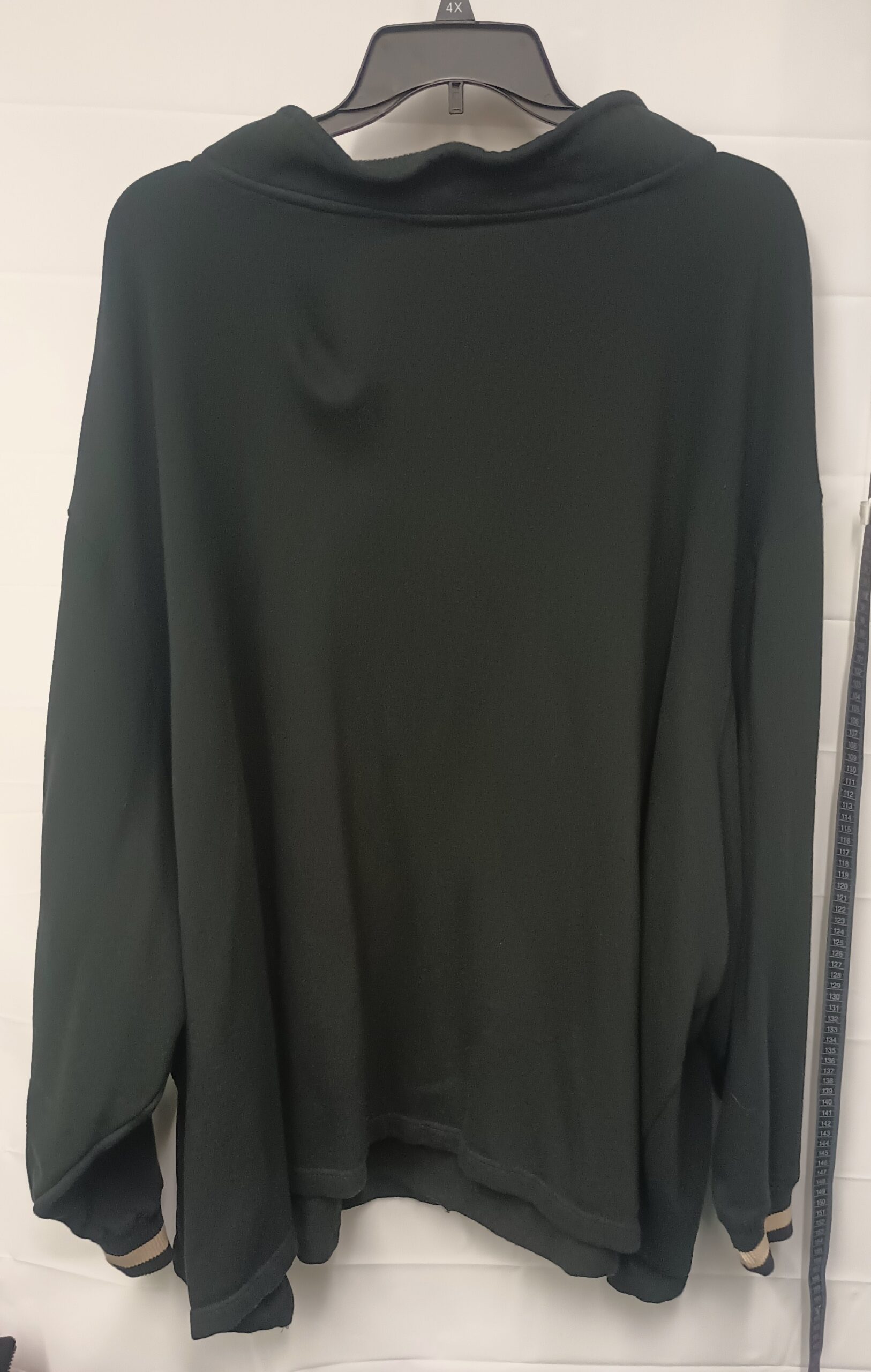 This gently used King Size three quarter zip sweatshirt. Is black with a white strip on the inside of the collar and on the cuffs of the sleeves. It’s made of a blend of 80% cotton and 20% polyester. It has a little stretch and it is an 8x. It is 34 inches from the shoulder to the waist and it has no pockets and no hood.