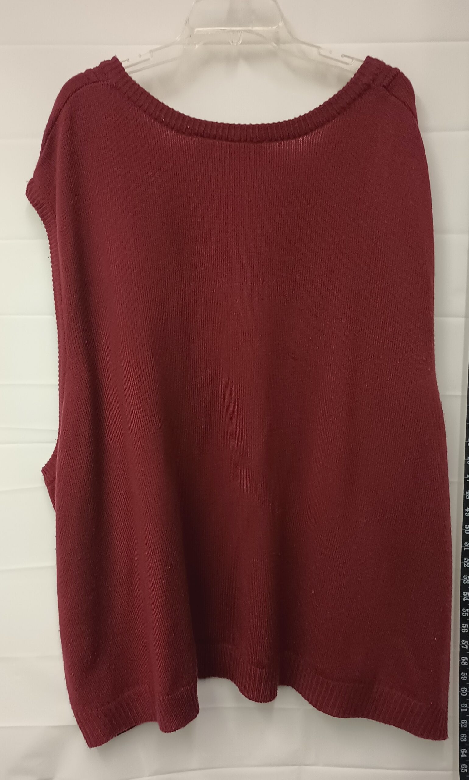 This new condition kingsize sweater vest. Is maroon and made of 100% acrylic. It has medium stretch and is an 8x. It is 35 inches from shoulder to waist.